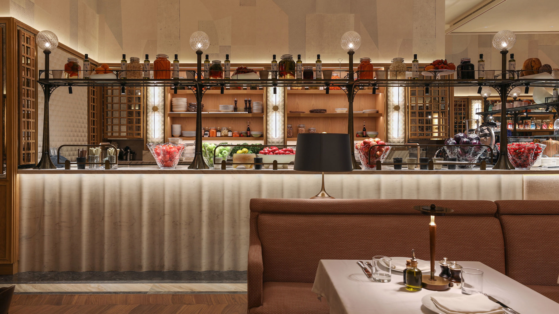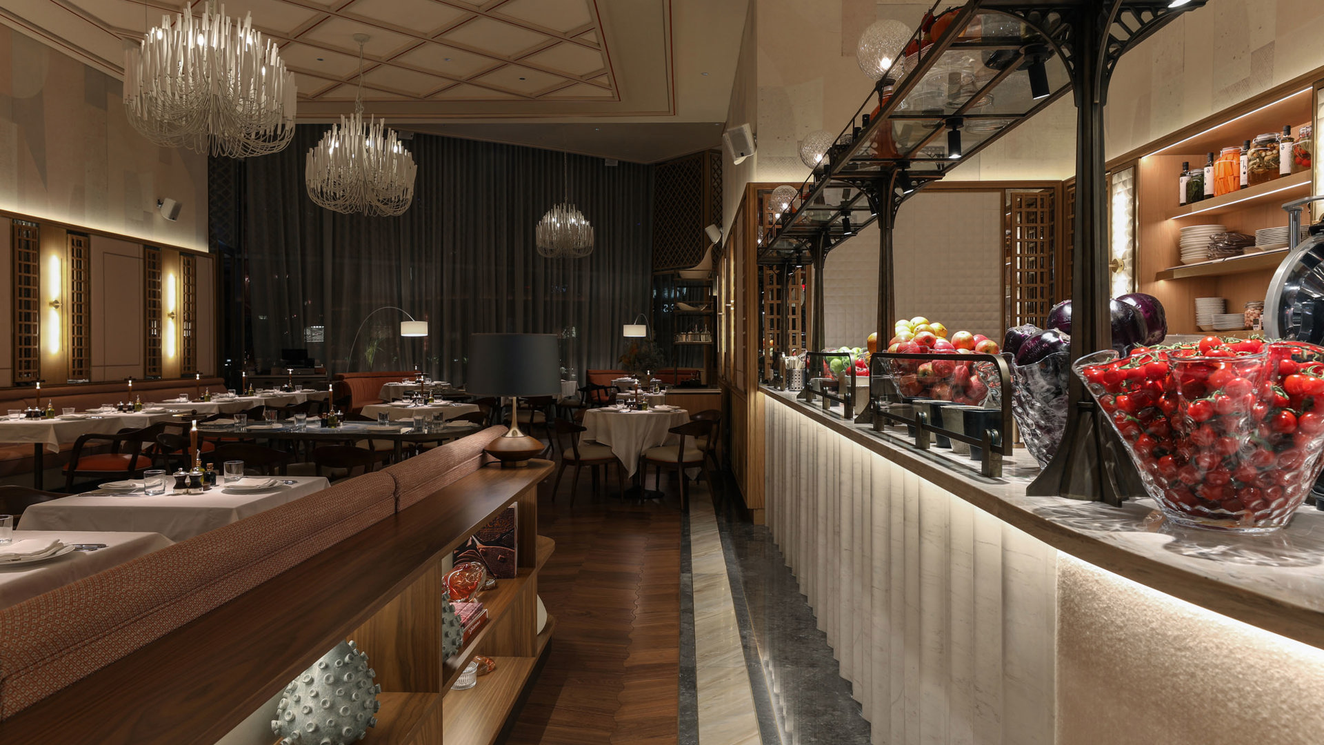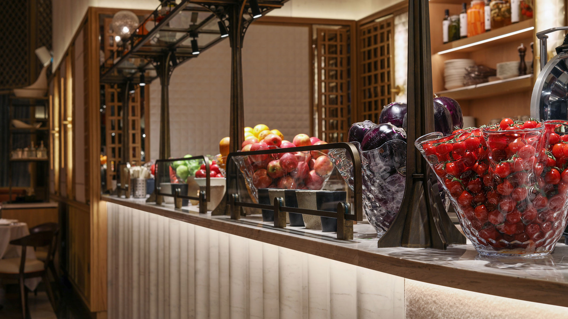 The design of the restaurant by interior design firm Sagrada takes its inspiration from the Jardin Du Palais, a Parisian garden which showcases French, British and African plants. Nature is a focal point of the venue’s décor, from the elegant botanical conservatory to the breath-taking views of the Dubai Fountain.