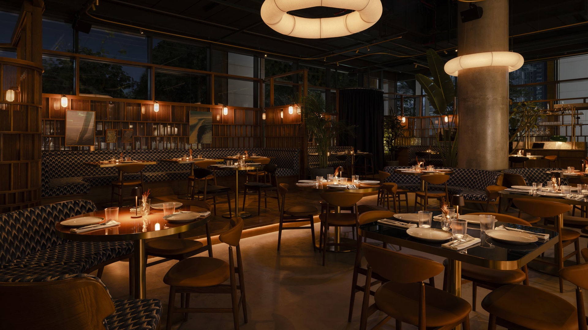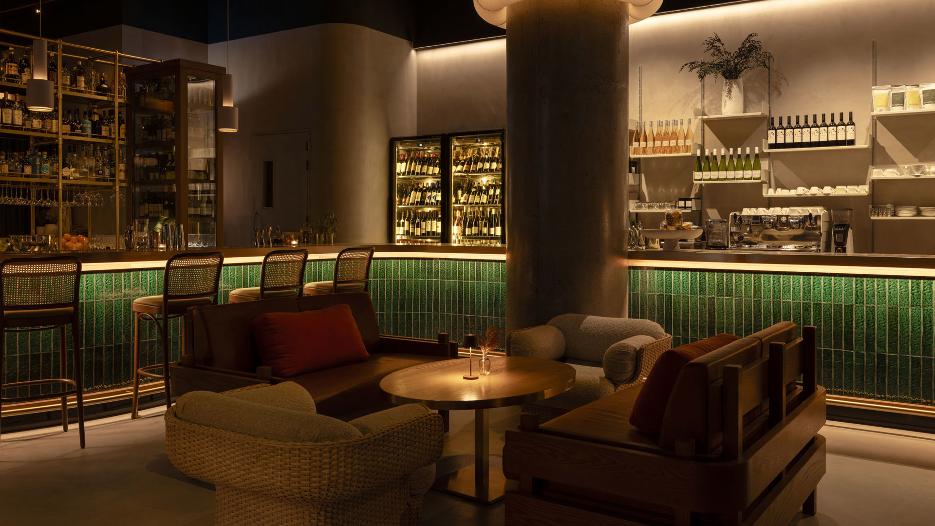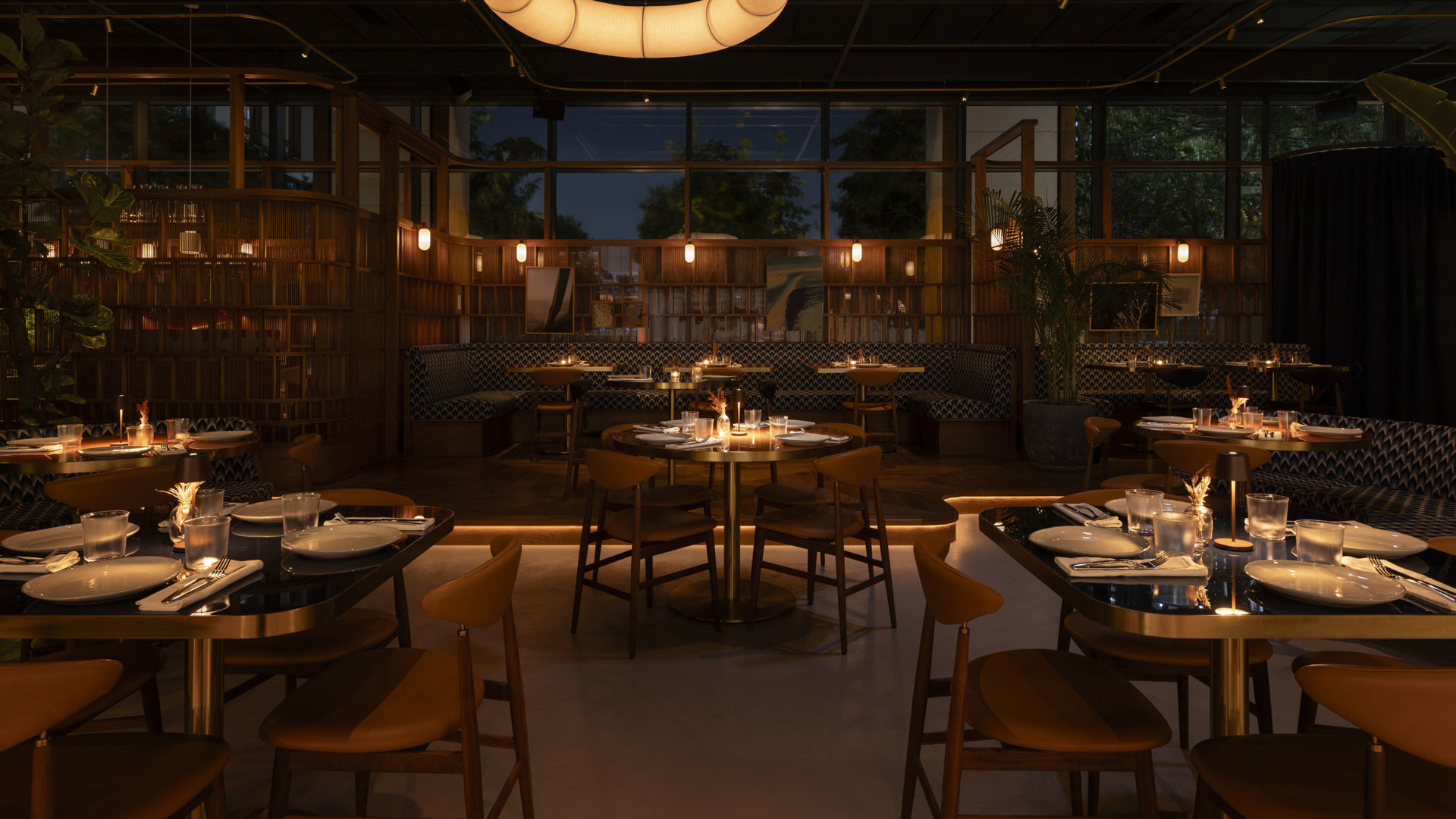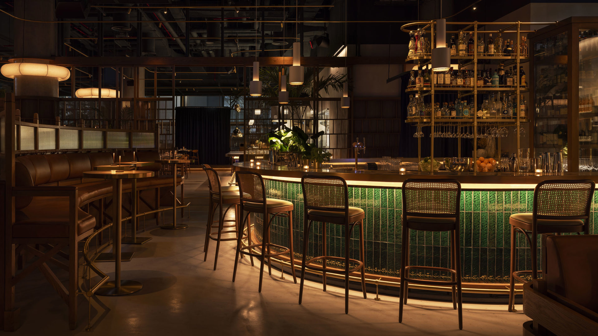 The spatial layout is carefully orchestrated to encourage both intimacy and energy, featuring a layered mix of bar seating, relaxed lounges, high tables, a DJ booth, and an 80-seat restaurant anchored by an open kitchen. Material selections—rattan, linen, natural woods, and leather—are paired with lush areca palms and vibrant artwork curated by founder Hashem Montasser, creating an environment that is both sensorially rich and deeply personal. The result is a space that fosters storytelling and social exchange through deliberate, human-centric design.