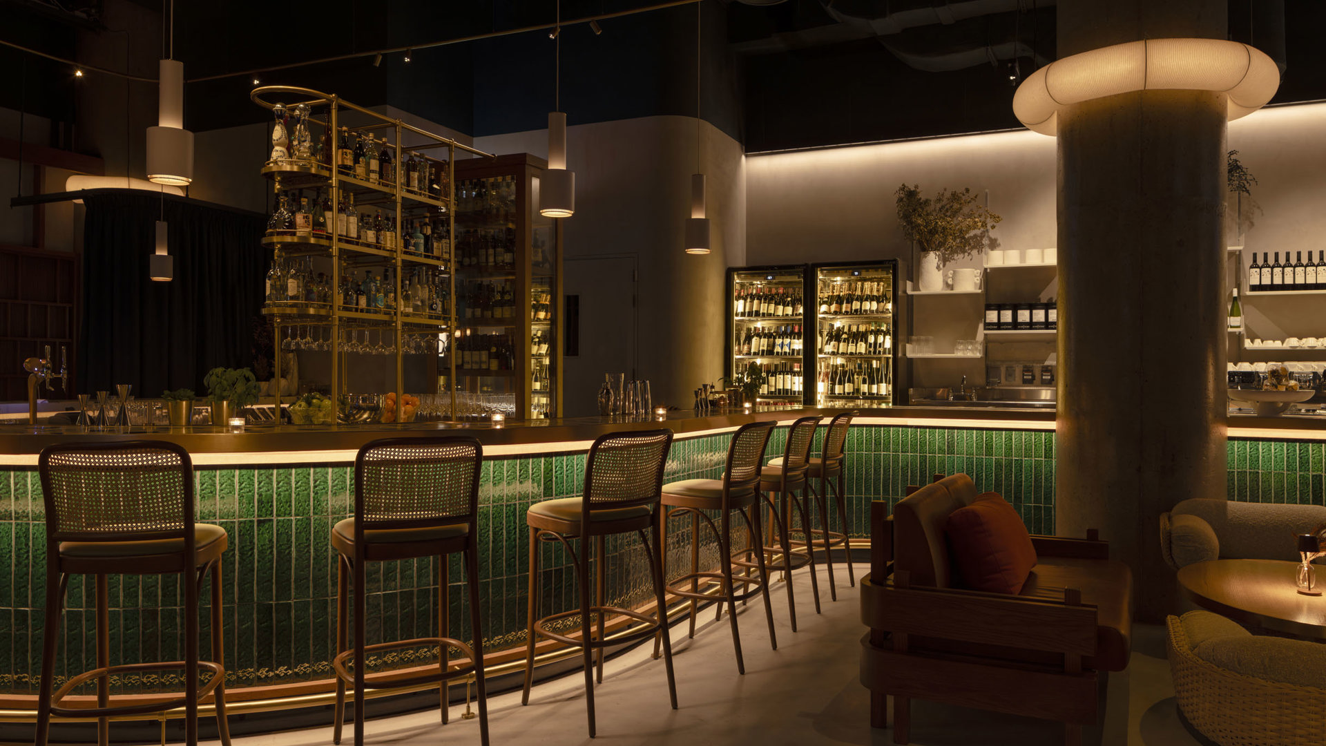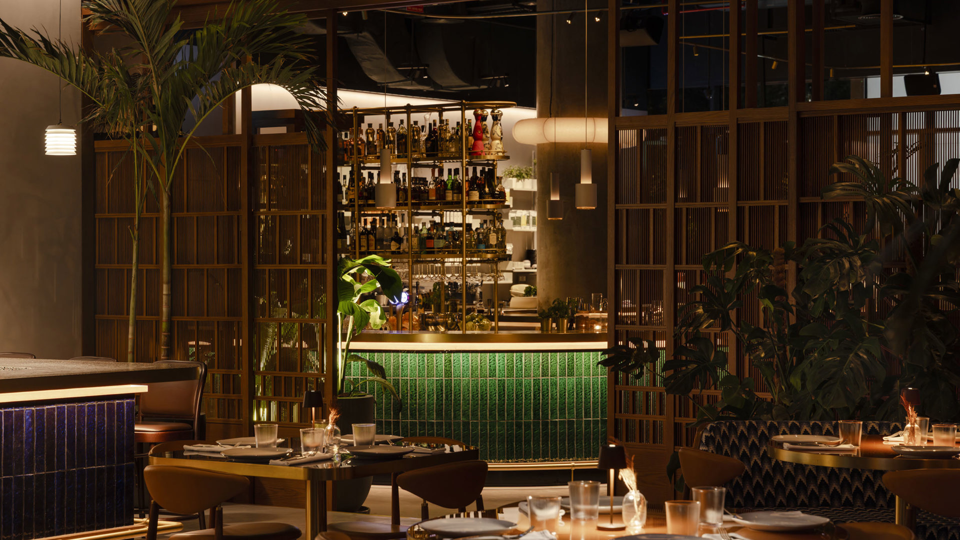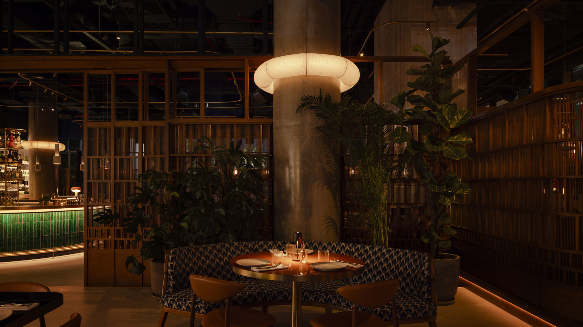 The spatial layout is carefully orchestrated to encourage both intimacy and energy, featuring a layered mix of bar seating, relaxed lounges, high tables, a DJ booth, and an 80-seat restaurant anchored by an open kitchen. Material selections—rattan, linen, natural woods, and leather—are paired with lush areca palms and vibrant artwork curated by founder Hashem Montasser, creating an environment that is both sensorially rich and deeply personal. The result is a space that fosters storytelling and social exchange through deliberate, human-centric design.