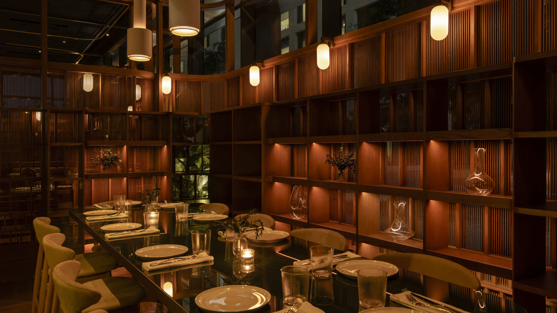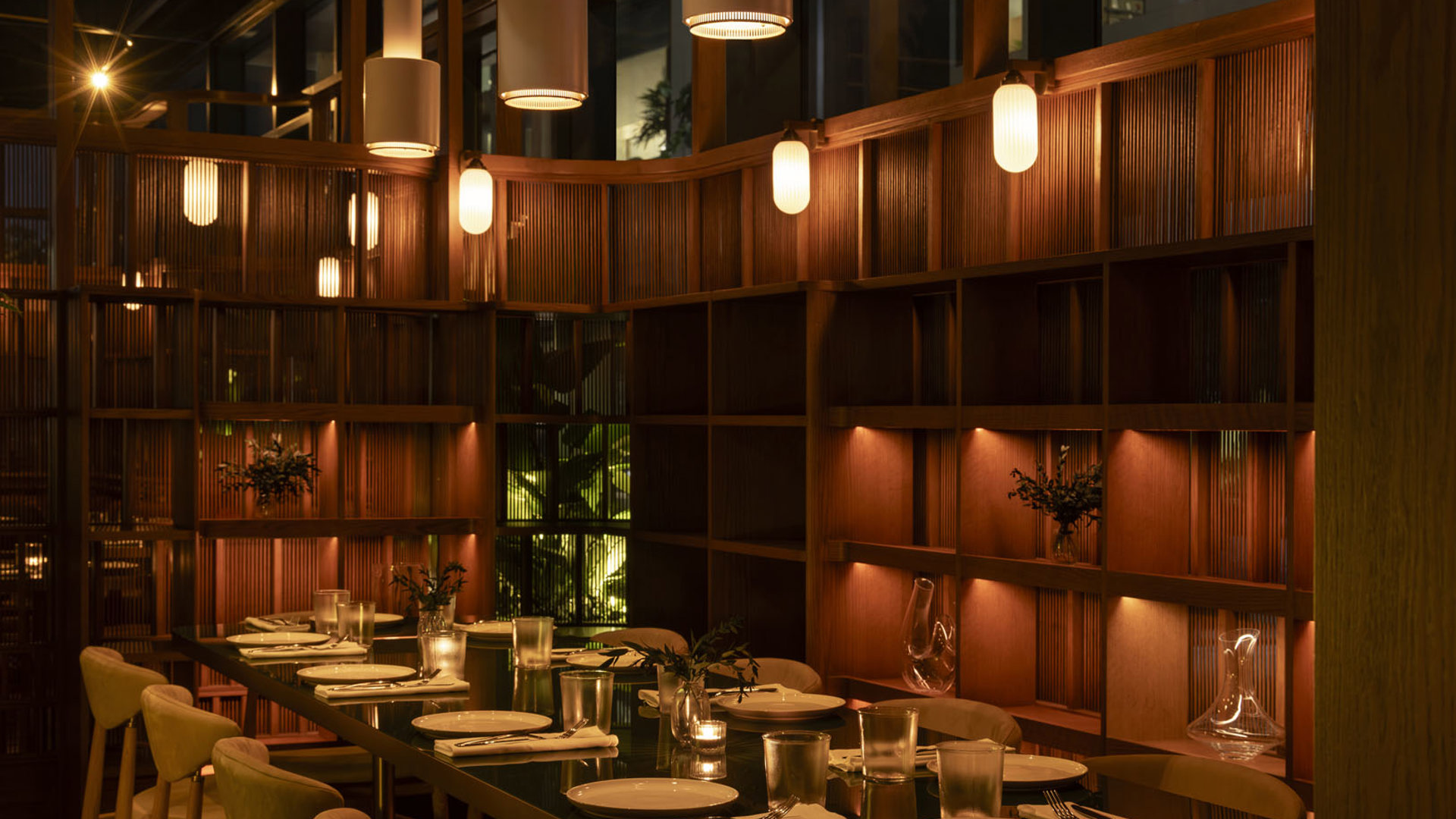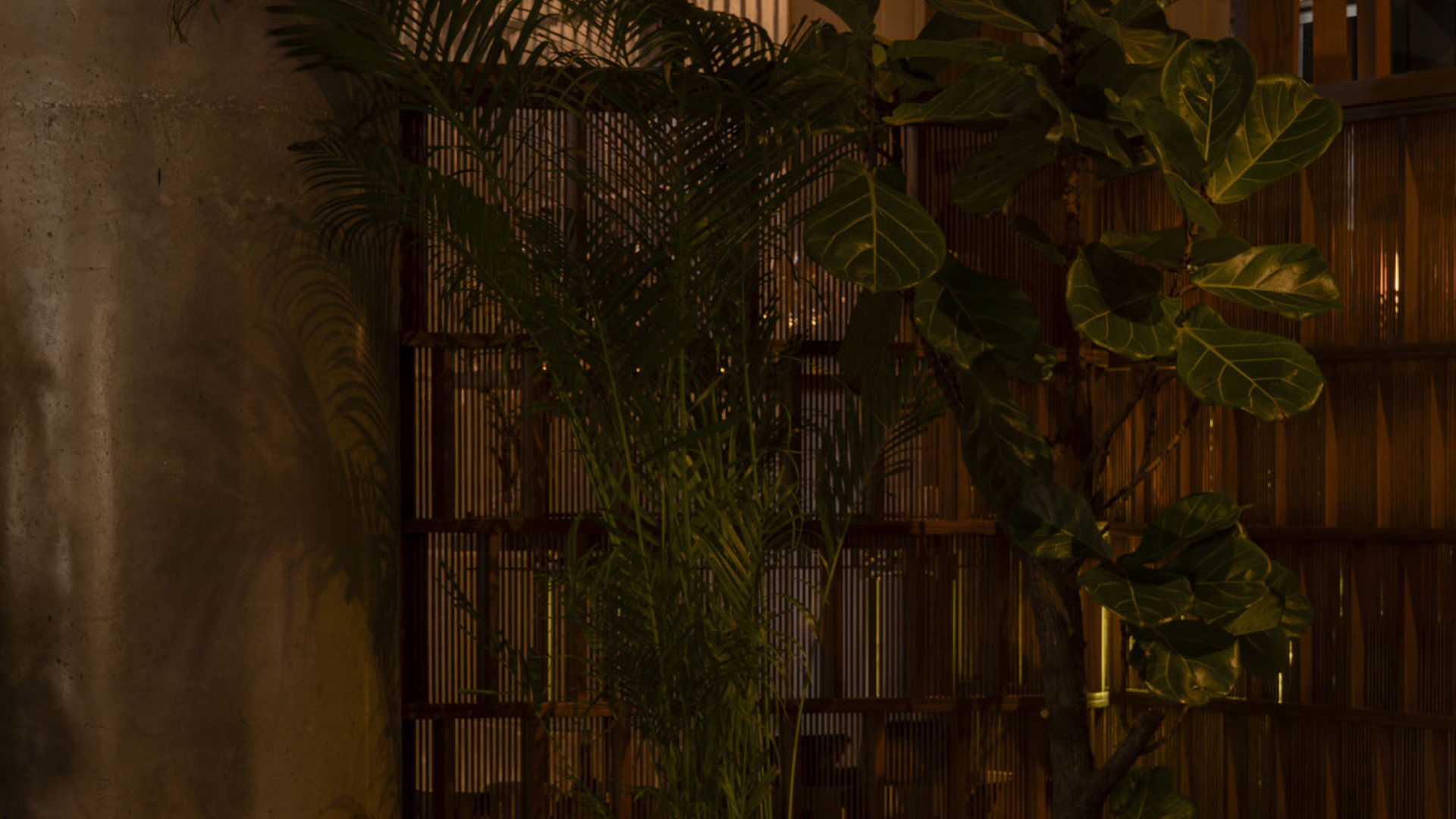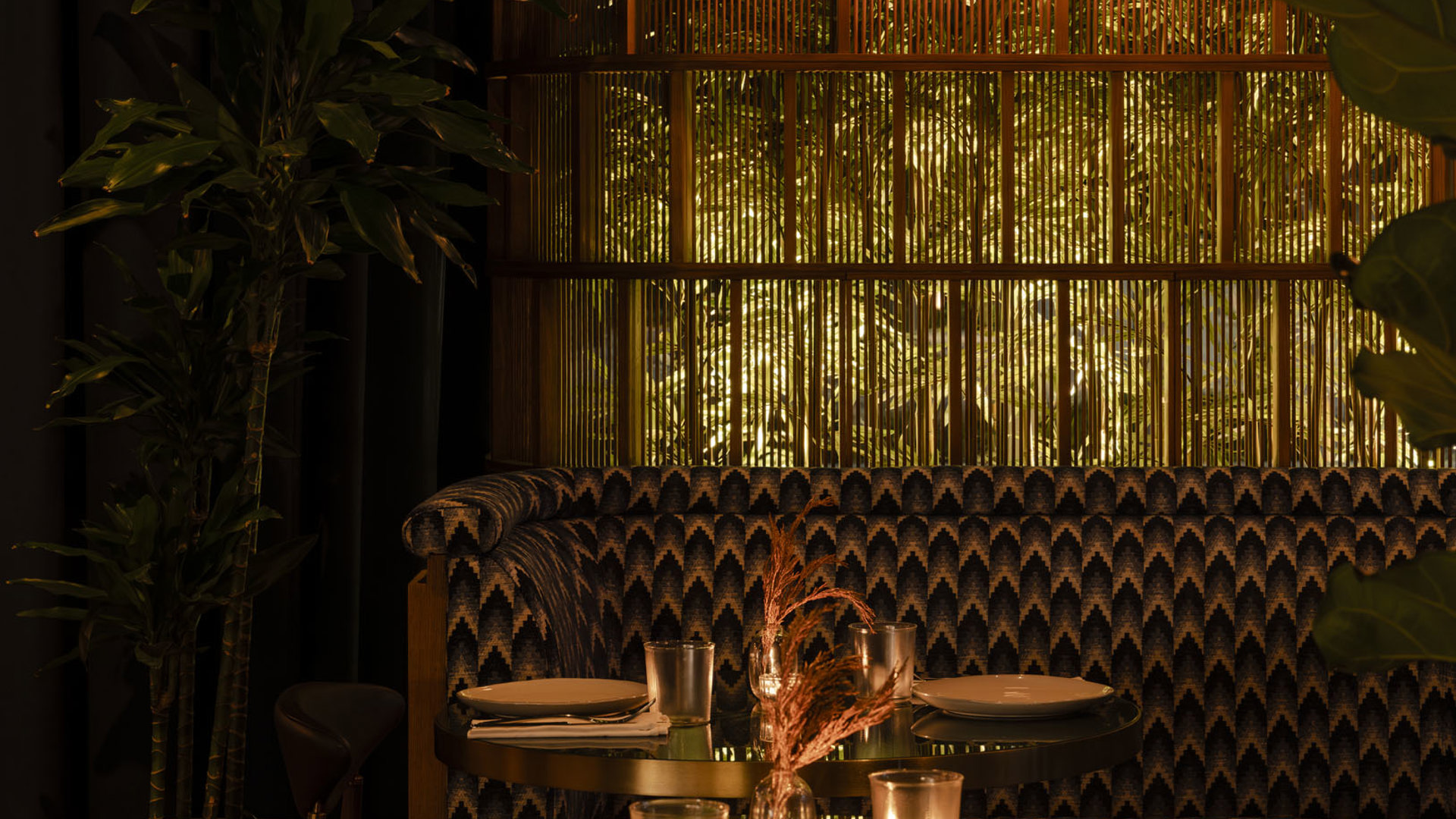 The spatial layout is carefully orchestrated to encourage both intimacy and energy, featuring a layered mix of bar seating, relaxed lounges, high tables, a DJ booth, and an 80-seat restaurant anchored by an open kitchen. Material selections—rattan, linen, natural woods, and leather—are paired with lush areca palms and vibrant artwork curated by founder Hashem Montasser, creating an environment that is both sensorially rich and deeply personal. The result is a space that fosters storytelling and social exchange through deliberate, human-centric design.